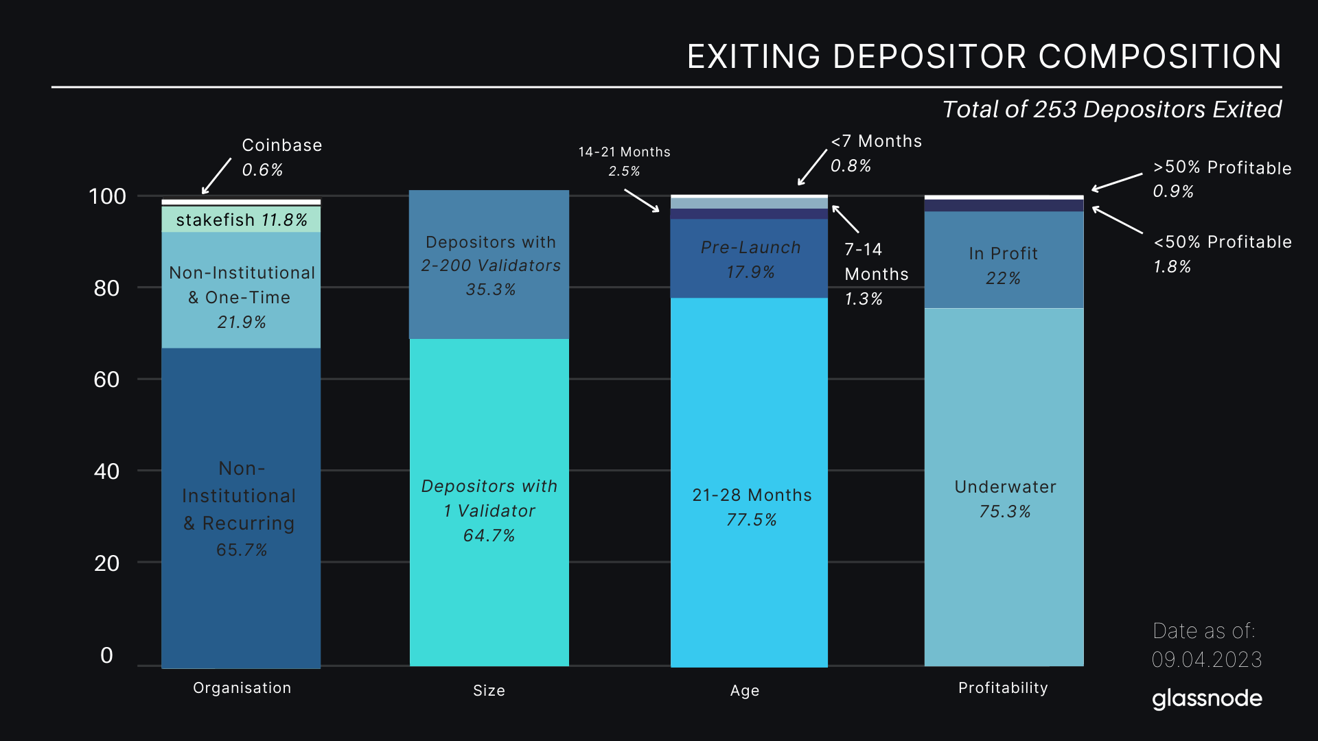 Исходя из этих определений эксперты Glassnode считают депозиторов самым важным фактором в определении последствий Shanghai. Депозиторов также классифицировали по возрасту — то есть времени внесения монет в смарт-контракт, размеру или количеству валидаторов под управлением, доле валидаторов в прибыли и типу, будь то индивидуальные депозиторы или организации.