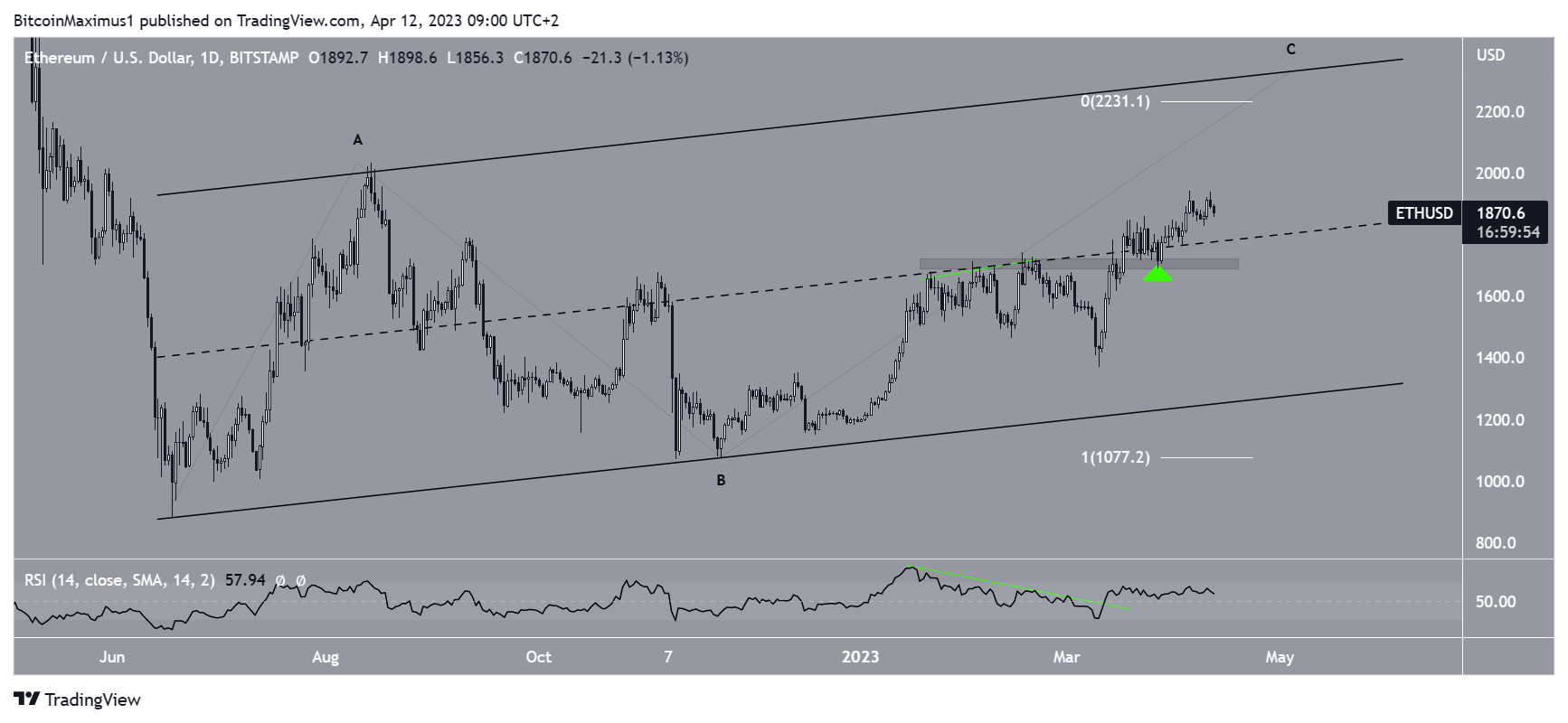 Кроме того, с июня 2022 года цена находится внутри восходящего параллельного канала, хотя его уровни поддержки и сопротивления не были в достаточной мере протестированы рынком на прочность. Тем не менее, срединная линия этого канала несколько раз сыграла роль сопротивления, подтвердив жизнеспособность паттерна. 4 апреля курс ETH прорвал срединную линию и в последующие 24 часа ощутимо укрепился. Если этот тренд продолжится, цена может достичь линии сопротивления в районе $2400.