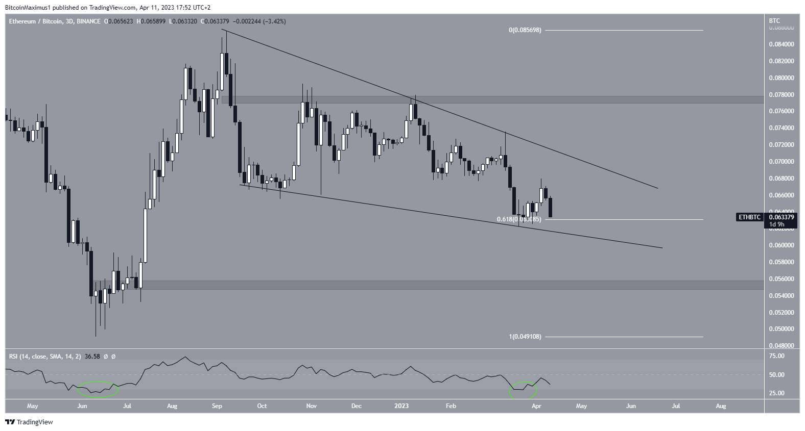 Тем временем интересная ситуация наблюдается и в паре ETH/BTC. Здесь цена с сентября 2022 года снижалась внутри паттерна «нисходящий клин». Эта модель считается бычьей, и это значит, что в конечном итоге цена может совершить бычий прорыв из нее.