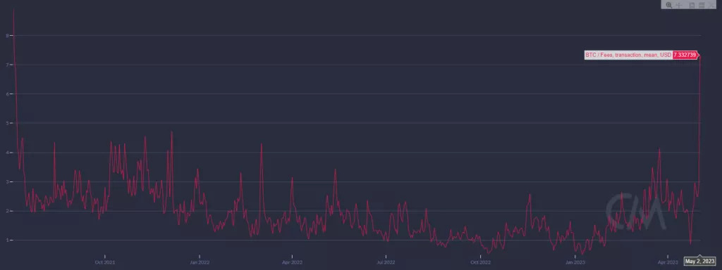 Схожая ситуация и по биткоину — 2 мая средняя комиссия за транзакцию превысила $7. Подобные значения наблюдались в июле 2021 года.