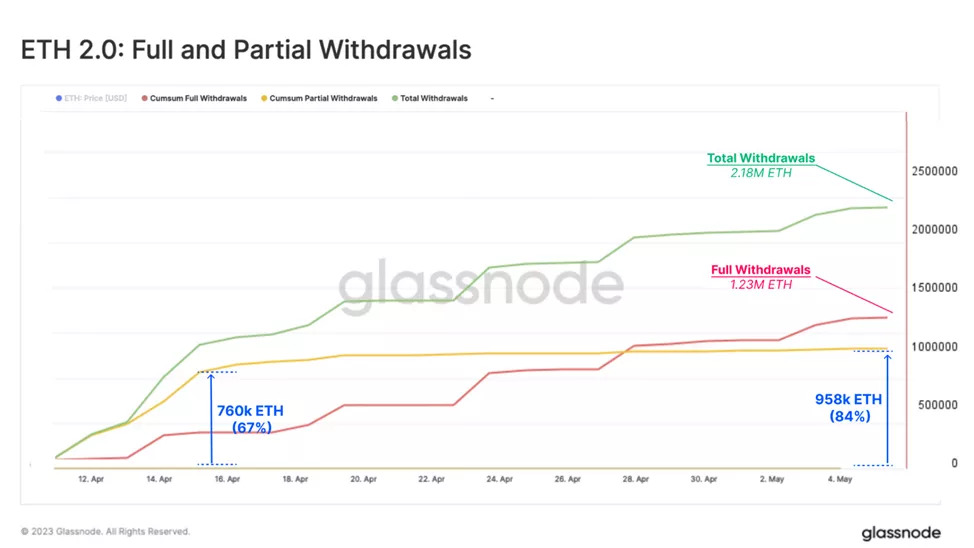 Как показывает иллюстрация ниже, в первые часы после Shapella, частичное высвобождение средств сформировало основную массу вывода монет из депозитного контракта. В дальнейшем возросла доля полных выводов.