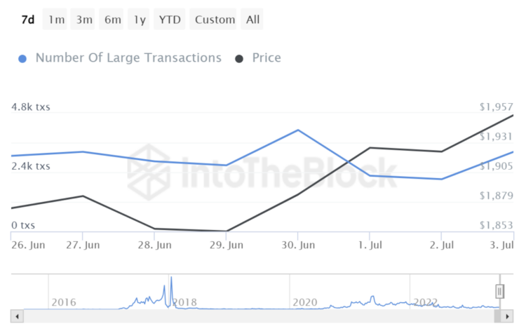 В ночь на среду, 5 июля, эфир подорожал до $1940, и киты готовят почву для взлета криптовалюты до $2000.