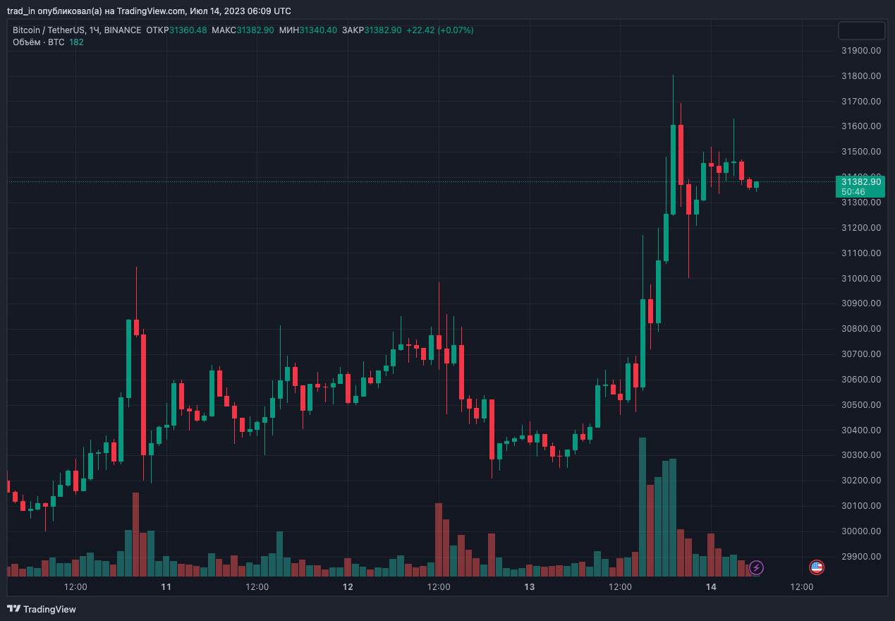Биткоин прибавил за минувшие 24 часа 3,5%, пробив уровень $31 000. Текущая цена — $31 382.