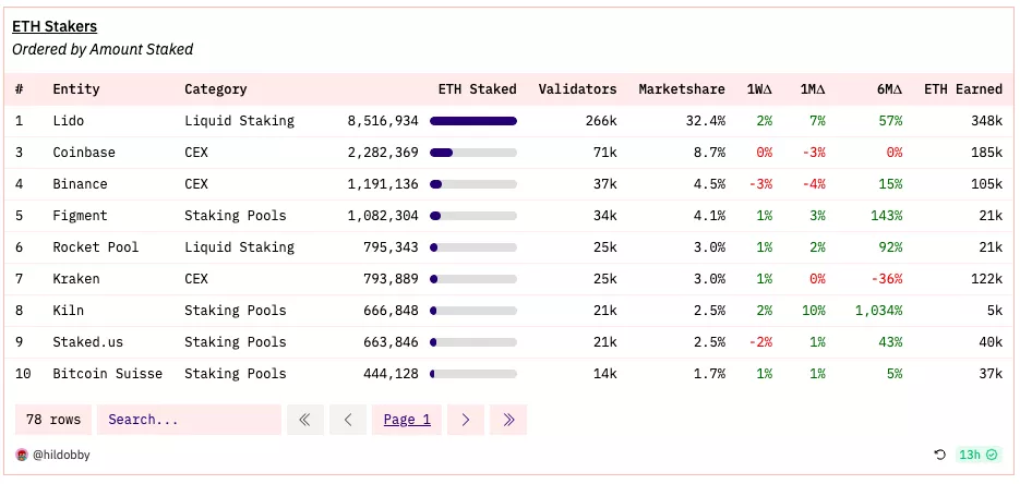 Согласно данным дашборда Dune, на момент написания на платформу приходится 32,4% всех заблокированных ETH. При этом ее ближайший конкурент — Coinbase — занимает только 8,7% рынка.