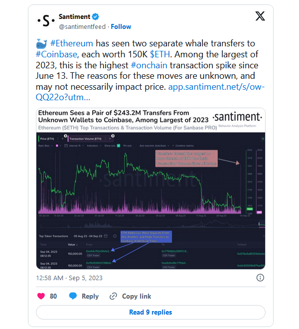 Что произошло? По данным трекера Whale Alert, 4 сентября с двух кошельков на американскую криптобиржу Coinbase одновременно было переведено по 149 999 $ETH общей стоимостью свыше 468 млн долларов. Аналитики платформы Santiment отметили, что это крупнейший всплеск ончейн-активности с 13 июня и одни из крупнейших транзакций за весь 2023 год.