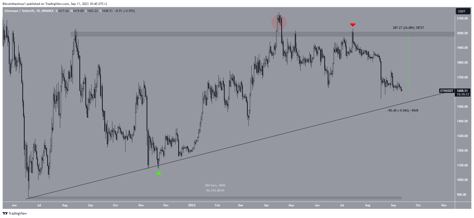 Сейчас ETH приближается к восходящей линии поддержки, расположенной на уровне $1500. Эта линия существует на графике с момента начала всего восходящего движения в июне 2022 года. Она измеряет угол наклона роста в течение 450 дней.