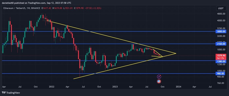 Инвесторам и трейдерам следует обратить внимание на две модели прорыва, которые сформировались на недельном графике ETH. Одна из них, появившаяся за последние несколько месяцев, — модель симметричного треугольника. Это говорит о том, что цена альткоина может вырасти с конца 2023 года по первый квартал 2024 года.
