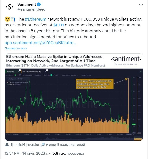 В среду, 13 сентября, аналитики из компании Santiment оценили рост количества уникальных кошельков в сети Ethereum. Согласно исследованию, текущая тенденция затронула как отправителей, так и получателей, а этот показатель стал вторым по величине за всё время существования Ethereum.