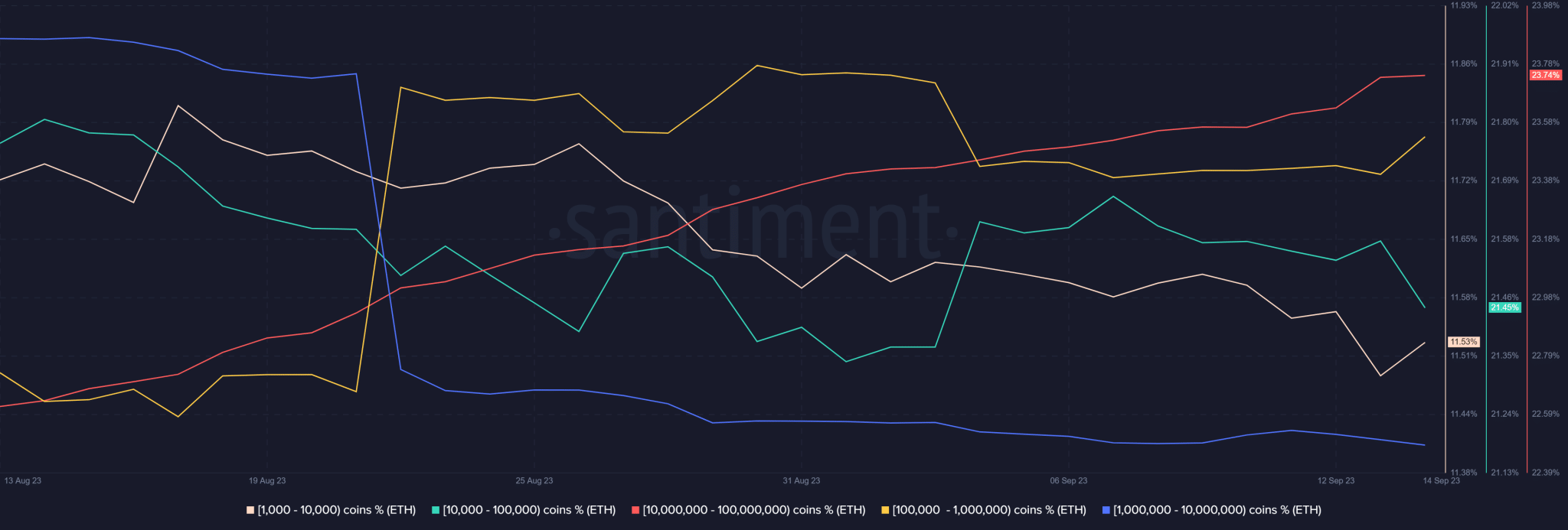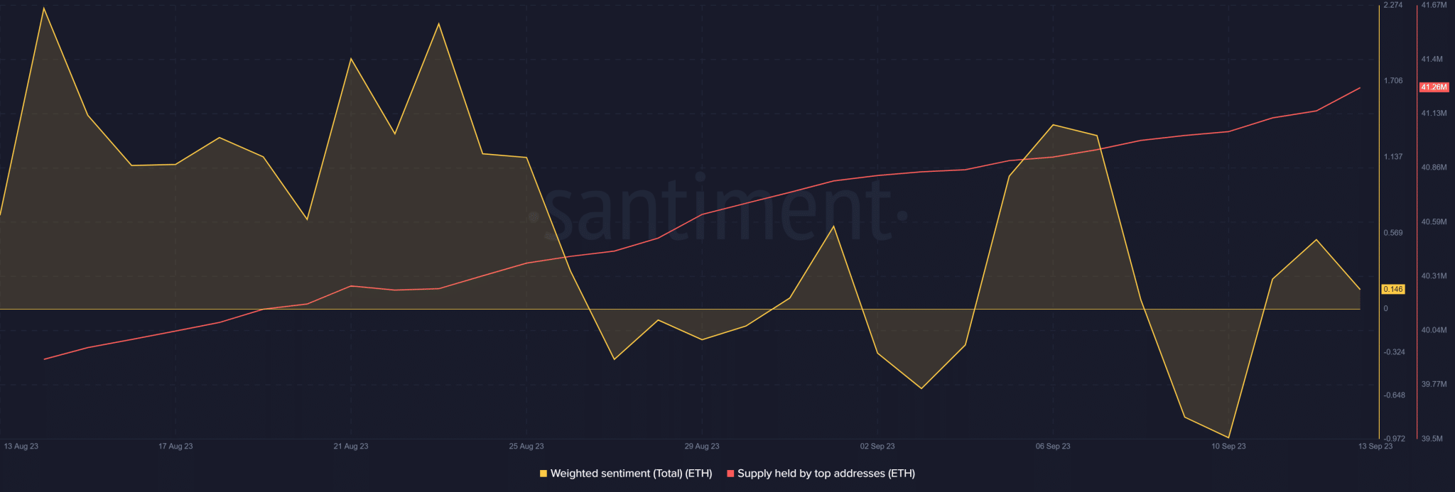 Несмотря на то, что криптокиты перешли в режим накопления, показатель взвешенных настроений вокруг ETH указывает на то, что эти игроки не слишком уверены в текущем ралли. Некоторые из них всё ещё способствуют продажам, тем самым ограничивая ценовой потенциал ETH.