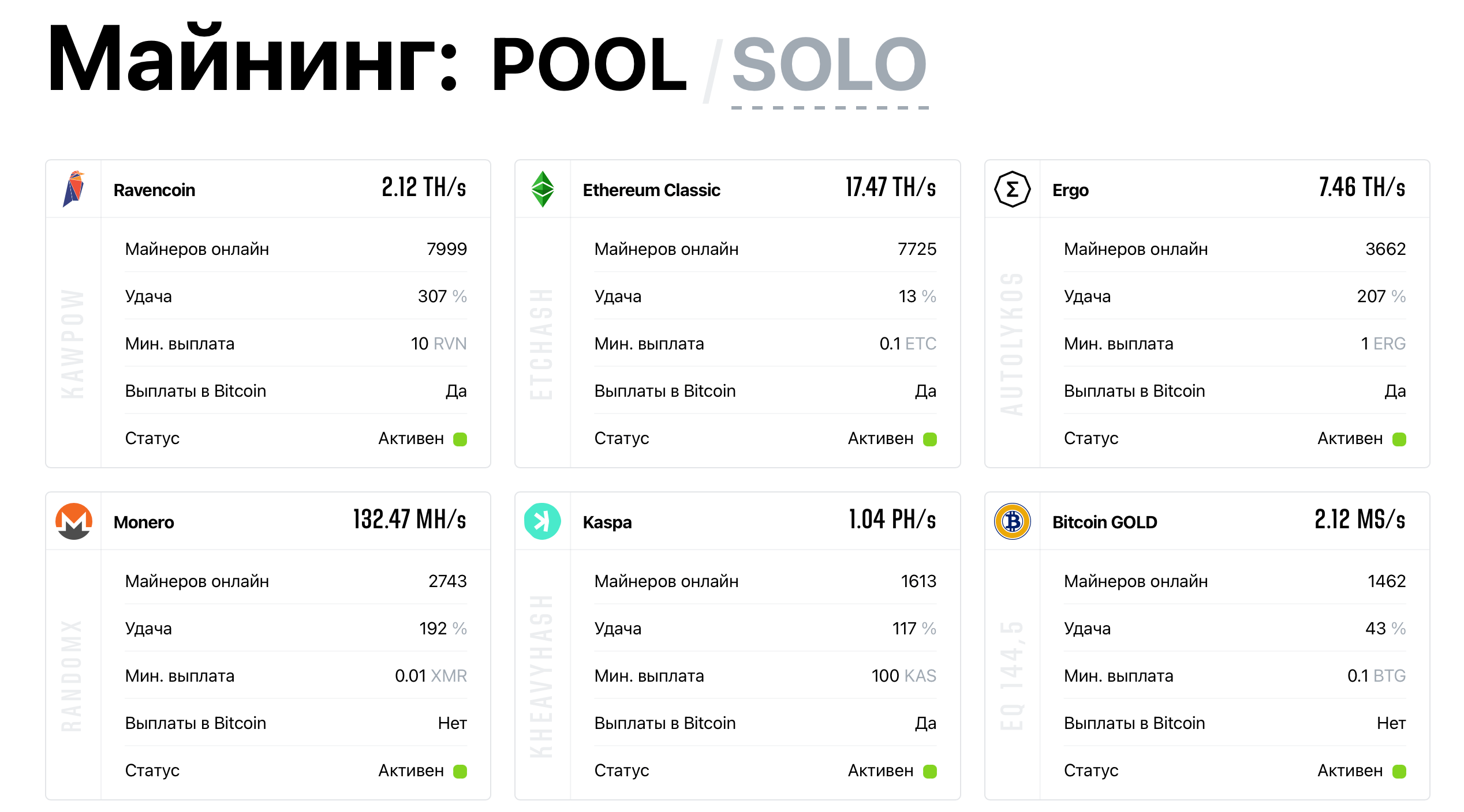 Как вы наверняка помните, до перехода на PoS Эфириум был главной криптовалютой для майнеров — причём с точки зрения как популярности, так и доходности. Теперь спустя год после работы сети Eth с валидаторами самыми популярными монетами среди майнеров являются Ravencoin, Ethereum Classic и Ergo. Подробнее с актуальным списком цифровых активов можно ознакомиться здесь.