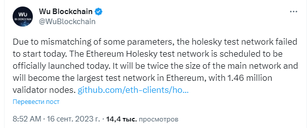 Основной разработчик Ethereum Паритош Джаянти подтвердил, что Holesky, которая содержит 1,4 миллиона валидаторов для решения проблем масштабируемости основной сети, станет крупнейшей тестовой сетью для блокчейна. Это третий тестнет на Ethereum после Goerli и Sepolia. Однако ожидаемый сегодня запуск не случился из-за неправильной конфигурации.