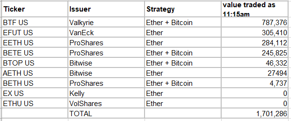 В тот же день только по одному фьючерсному инструменту Bitcoin Strategy ETF (BTF) от Valkyrie было зафиксировано 4.5 миллиона долларов торговых объёмов. По словам биржевого аналитика Эрика Балчунаса, запуск ETF на Эфириум принёс разве что разочарование. Вот реплика эксперта по этому поводу.