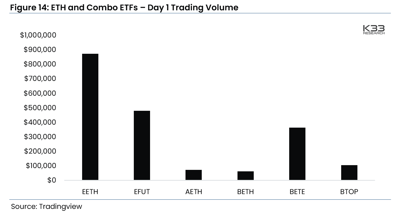 Наиболее популярным инструментом оказался Ether Strategy ETF (EETH) от ProShares. Он сгенерировал около 900 тысяч долларов торгового объёма за сутки.