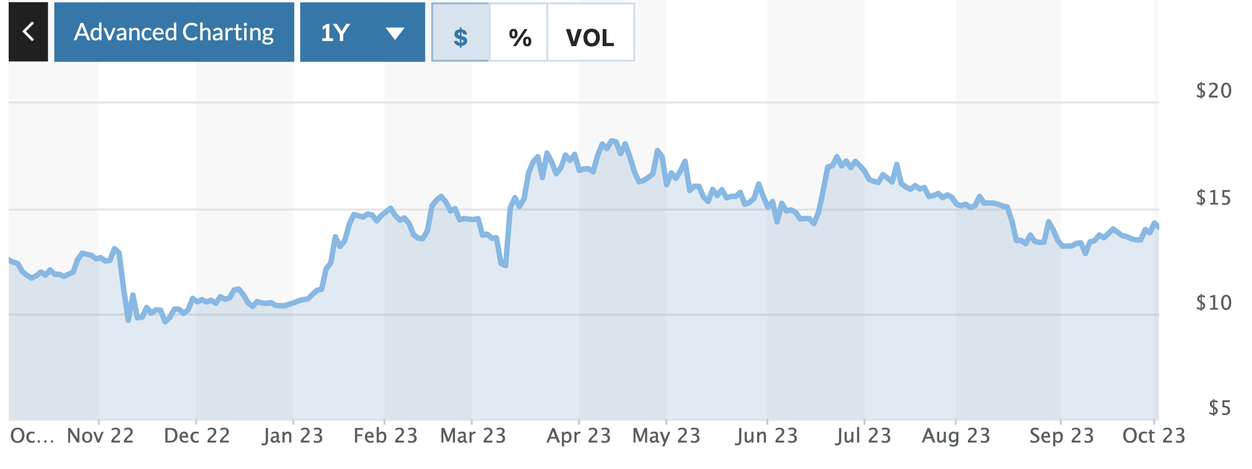 Изменения стоимости Биткоин-ETF под тикером BITO за последний год