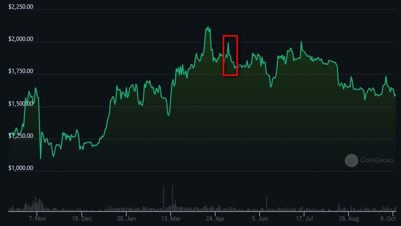 Продажи Ethereum Foundation не раз оказывались связаны с движением цены $ETH. Например, 6 мая фонд перевел около 15 000 монет на биржу Kraken. С локального максимума в $1993 курс за несколько дней снизился до уровня $1800.