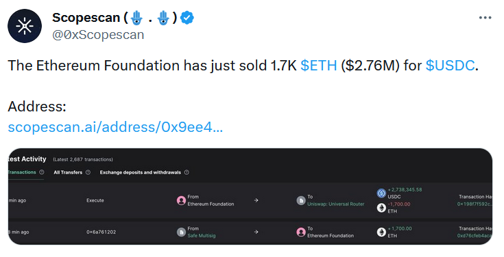 Фонд Ethereum Foundation обменял более 1 700 $ETH на $USDC. Представители пока никак не прокомментировали продажу такого количества токенов