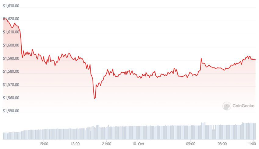 В моменте фонд продал $ETH по $1 611 за монету. Сейчас актив торгуется на отметке в $1 593. За последние сутки цена просела уже на 1,7%, согласно CoinGecko. В общей сложности за неделю стоимость $ETH опустилась на 4,3%.