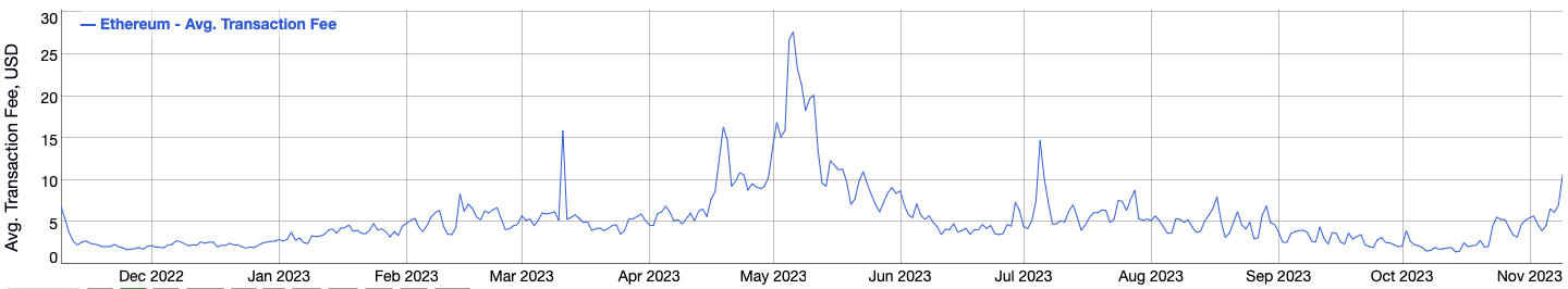 Для Ethereum средняя плата за газ находится на отметке $11,5 — рекорд с июля.