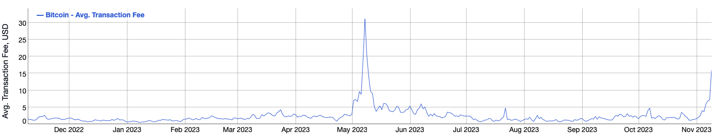 По данным BitInfoCharts, на момент написания средняя цена за транзакцию в блокчейне первой криптовалюты составляет около $15. Хотя показатель не самый высокий, это максимальный уровень с мая.