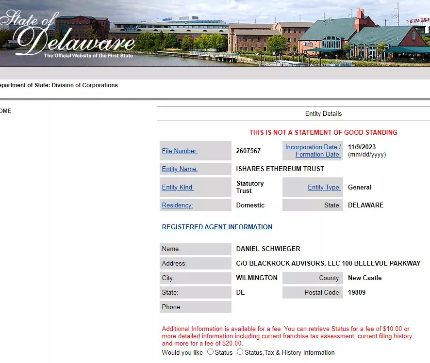 На сайте Департамента корпораций штата Делавэр появилась заявка от инвестгиганта BlackRock на запуск iShares Ethereum Trust — спотового ETF на базе второй по капитализации криптовалюты.