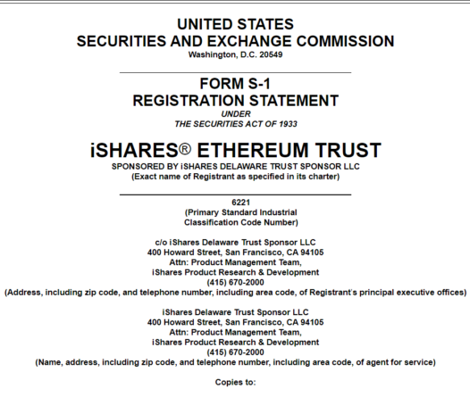 Бренд iShares ассоциируется с продуктами биржевых фондов BlackRock. Форма S-1 появилась через неделю после того, как BlackRock зарегистрировала организацию iShares Ethereum Trust в Отделе корпораций Департамента штата Делавэр.