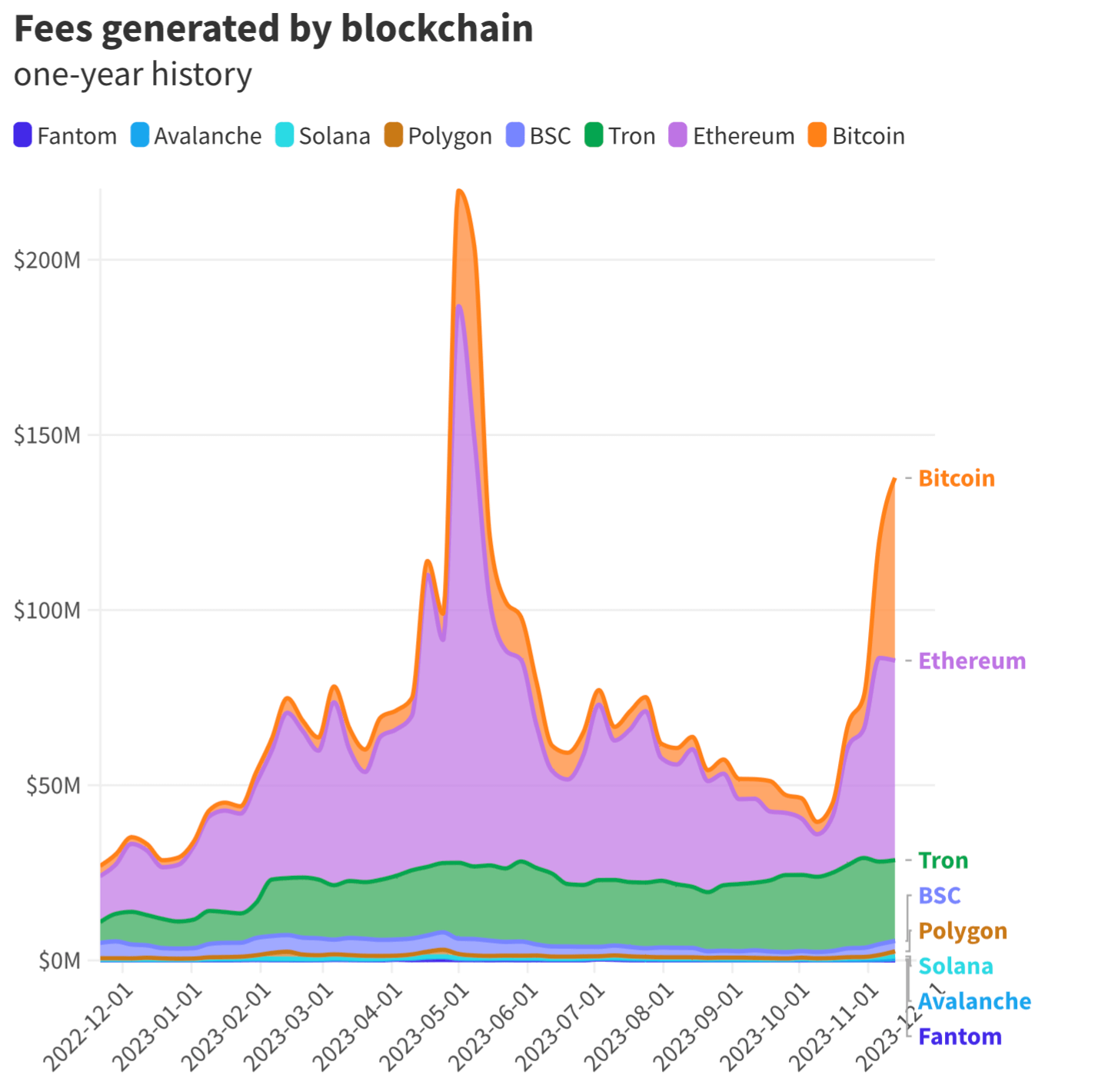 Накануне сеть Биткоина впервые с декабря 2020 года начала собирать больше комиссий, чем Эфириум. За последние четыре дня пользователи Биткоина заплатили майнерам около 40 миллионов долларов за обработку своих транзакций.