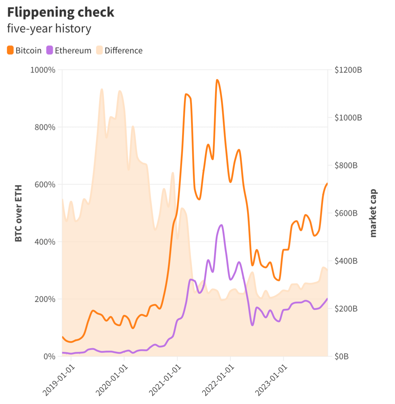 В ходе бычьего цикла рынка 2021 года Эфириум серьёзно приблизился к так называемому флиппенингу. Согласно данным источников Blockworks, во время медвежьего тренда 2019 года соотношение капитализации BTC к ETH составляло 925 процентов, то есть 130 против 14 миллиардов долларов. К концу 2021 года показатель сократился до 200 процентов, а значит отставание стало куда меньшим.