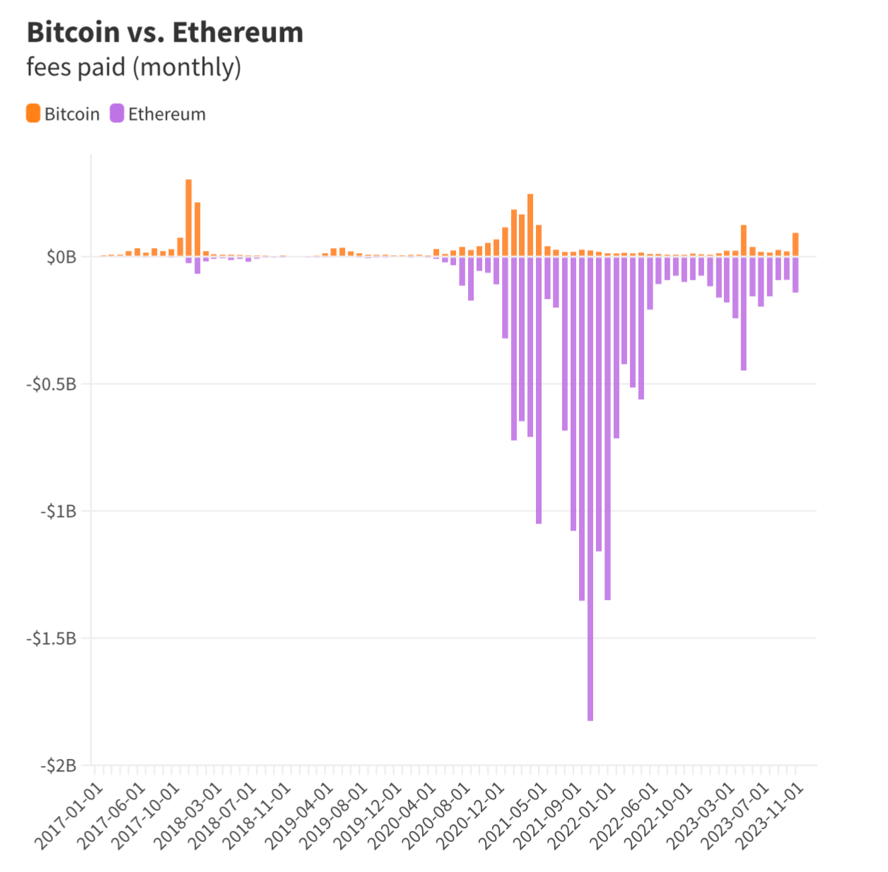 За тот же срок пользователям Эфириума пришлось отдать только 27 миллионов долларов. Кстати, значительная часть монет из этой суммы была сожжена, что сказалось на общем предложении криптовалюты ETH.