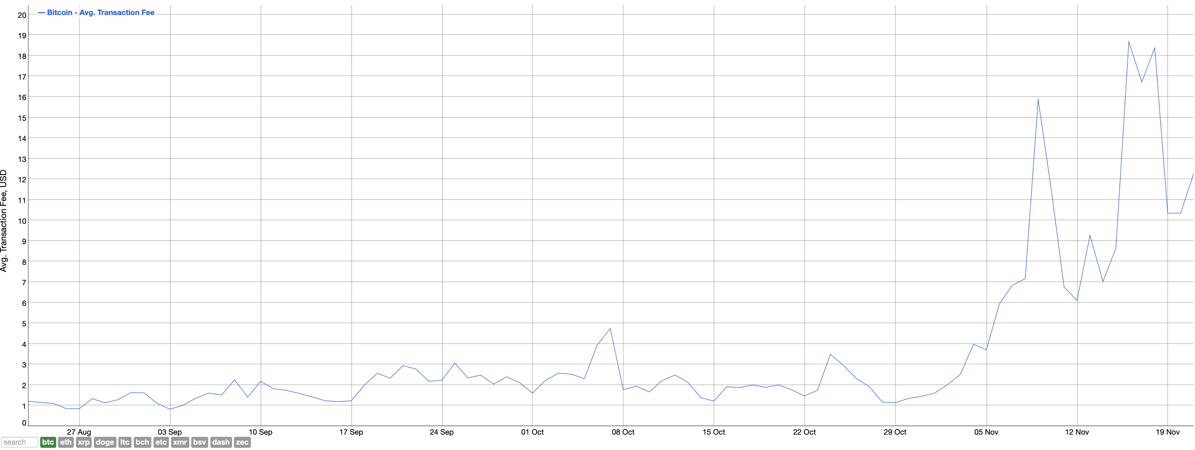 При этом максимальная средняя комиссия за тот же промежуток времени в Эфириуме составила 11.2 доллара от 13 ноября. Конечно, подобный уровень оплаты за переводы также нельзя назвать адекватным.