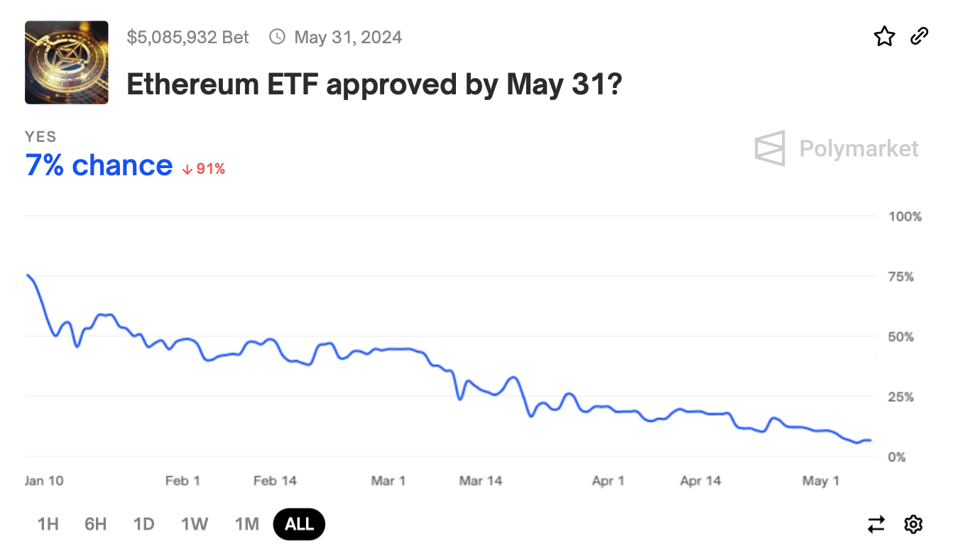 Падение вероятности одобрения ETF на Эфириум в мае 2024 года