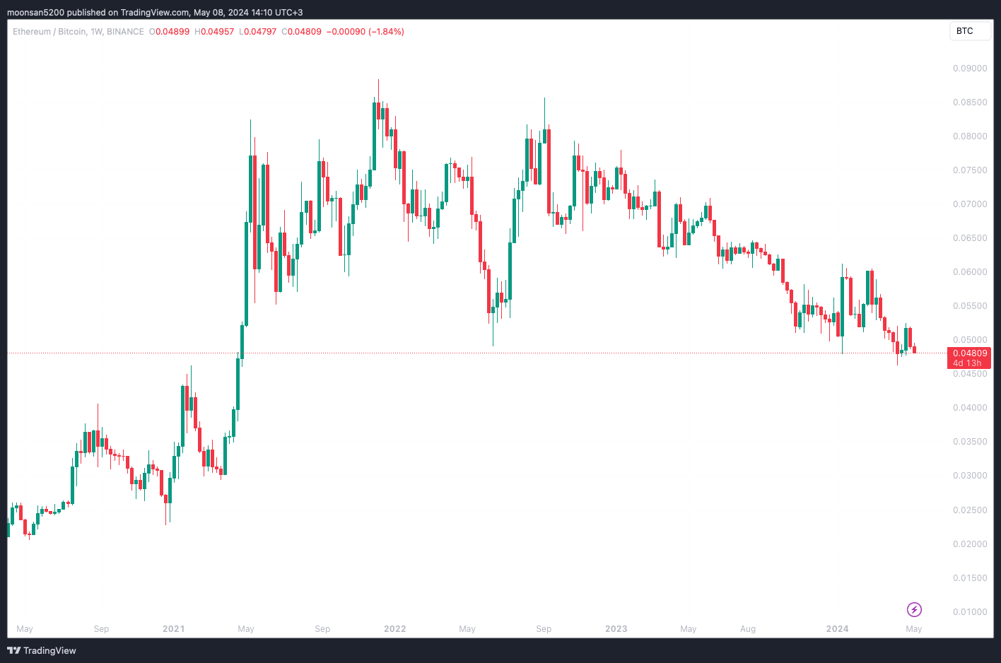 Эфириум в торговой паре к Биткоину в целом демонстрирует продолжительное падение уже на протяжении нескольких лет. Соответственно, общая тенденция заключается в том, что главная криптовалюта обходит ETH по доходности в течение более продолжительного периода времени.