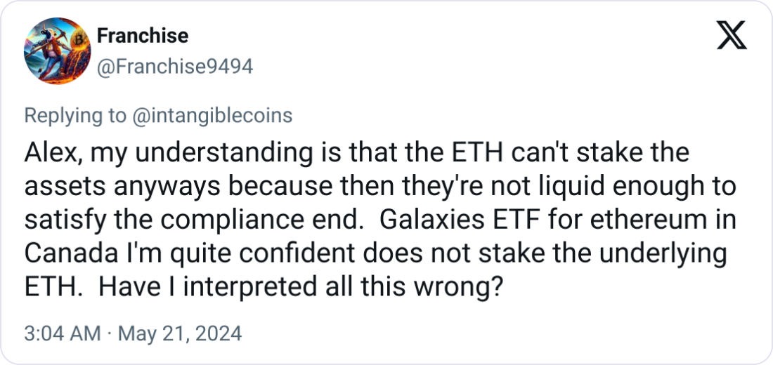 «Если предположение о развороте SEC на 180 градусов по Ethereum ETF верно, я бы предположил, что они пытаются проложить иглу между «ETH», НЕ являющимся ценной бумагой, и «стекингом ETH» (или, что еще более неубедительно, «стекингом ETH как услугой») в качестве ценных бумаг».