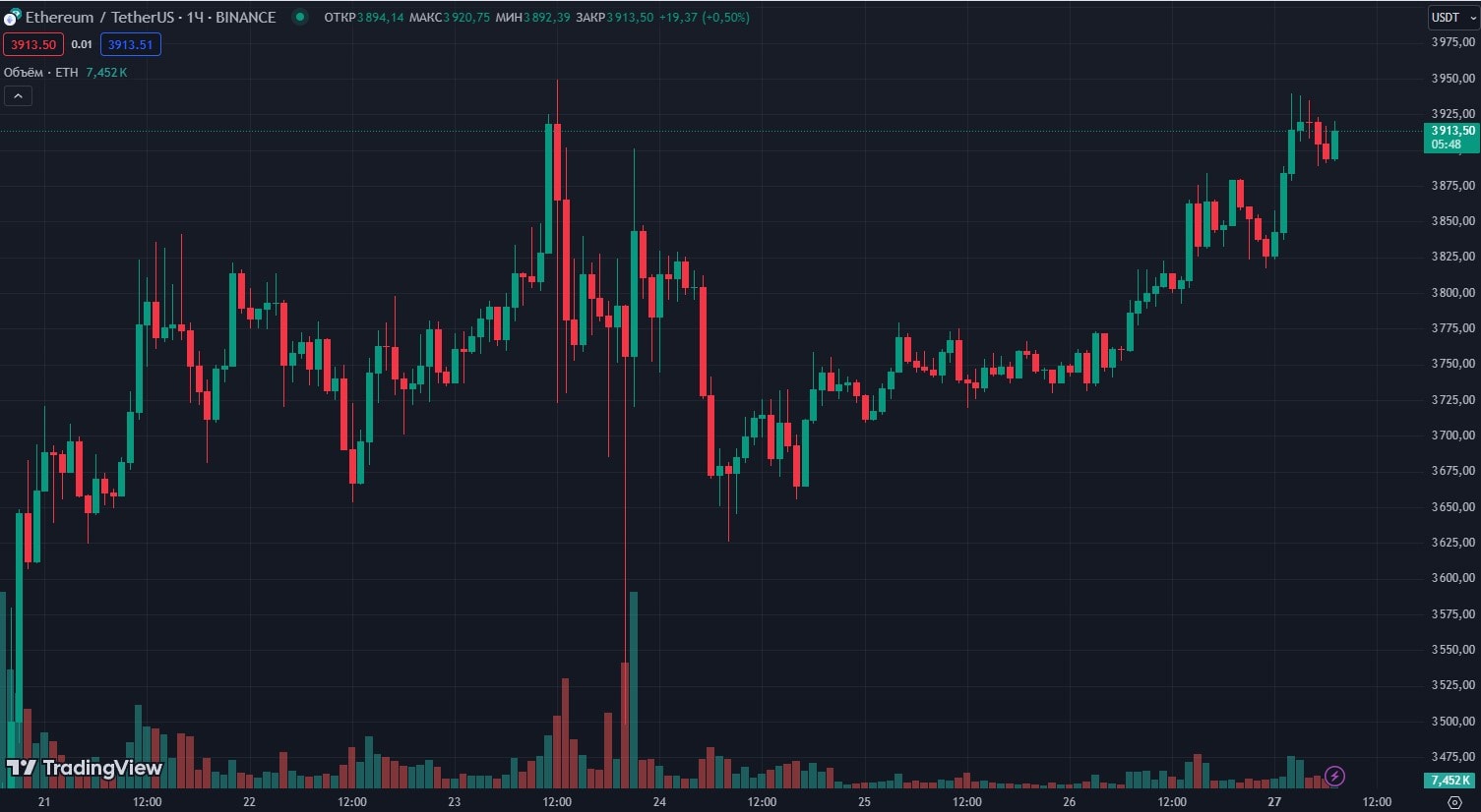 На фоне новости о сроках обновления Pectra токен Ethereum вырос на 4% за последние 24 часа. На момент публикации он торгуется выше $3900.