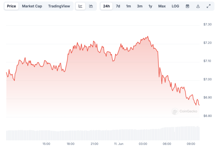 По данным CoinGecko, на момент написания материала криптовалюта экосистемы The Open Network торгуется по $6,90. За последние сутки котировки Toncoin просели на 1,6% на фоне общего падения крипторынка, связанного с оттоками из спотовых биткоин-ETF.