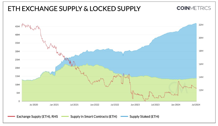 Предложение эфира на биржах сокращается, поскольку в контрактах на стекинг зафиксировано все больше ETH. Источник: Coin Metrics.