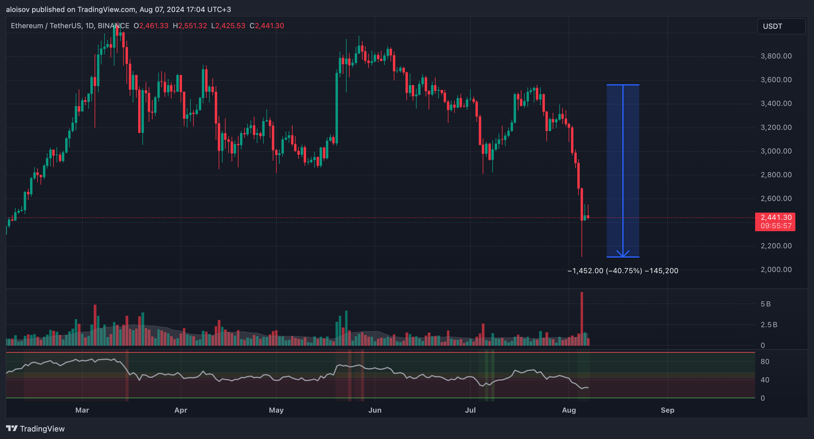 На момент написания статьи Ethereum торгуется по цене $2 441, что на 15% выше минимума от 5 августа, однако все еще на 40% ниже локального максимума, зафиксированного 22 июля.