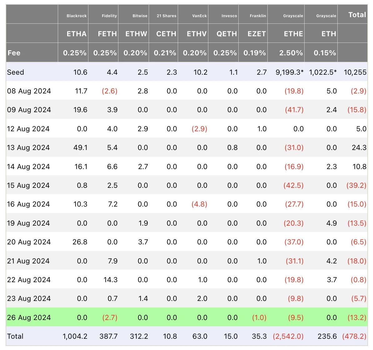Тем временем по итогам торговой сессии 26 августа общий отток средств из спотовых Ethereum-ETF составил $13,23 млн. По данным Farside Investors, за последние восемь дней из фондов вывели в совокупности $112 млн.