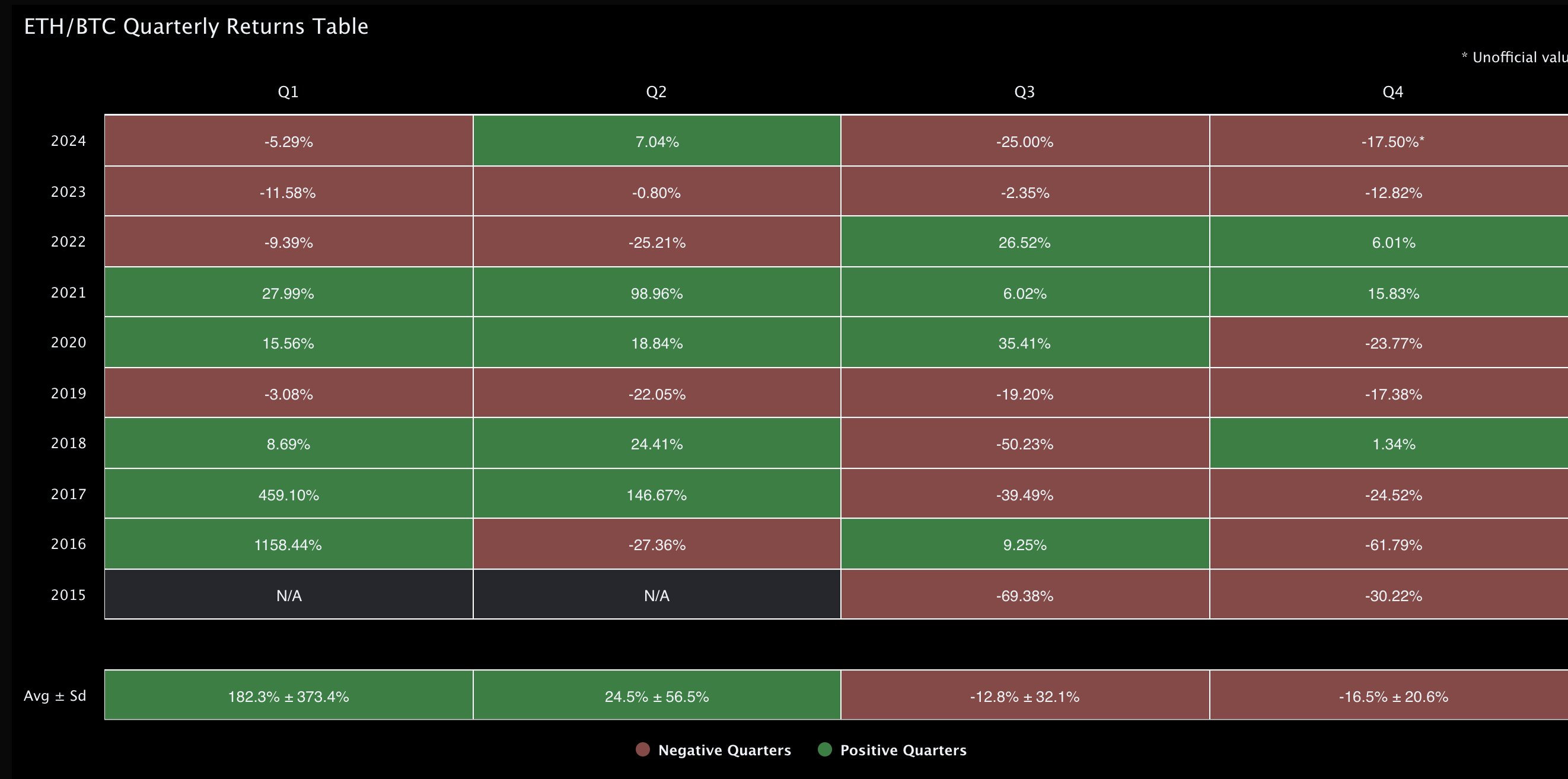 Интересную закономерность обнаружил Бенджамин Коуэн (Benjamin Cowen) из ITC Crypto: Ethereum традиционно показывает положительную квартальную доходность относительно биткоина в первой половине года, следующего за халвингом. Учитывая, что халвинг произошел в апреле 2024 года, первая половина 2025 года может стать благоприятным периодом для Ethereum.