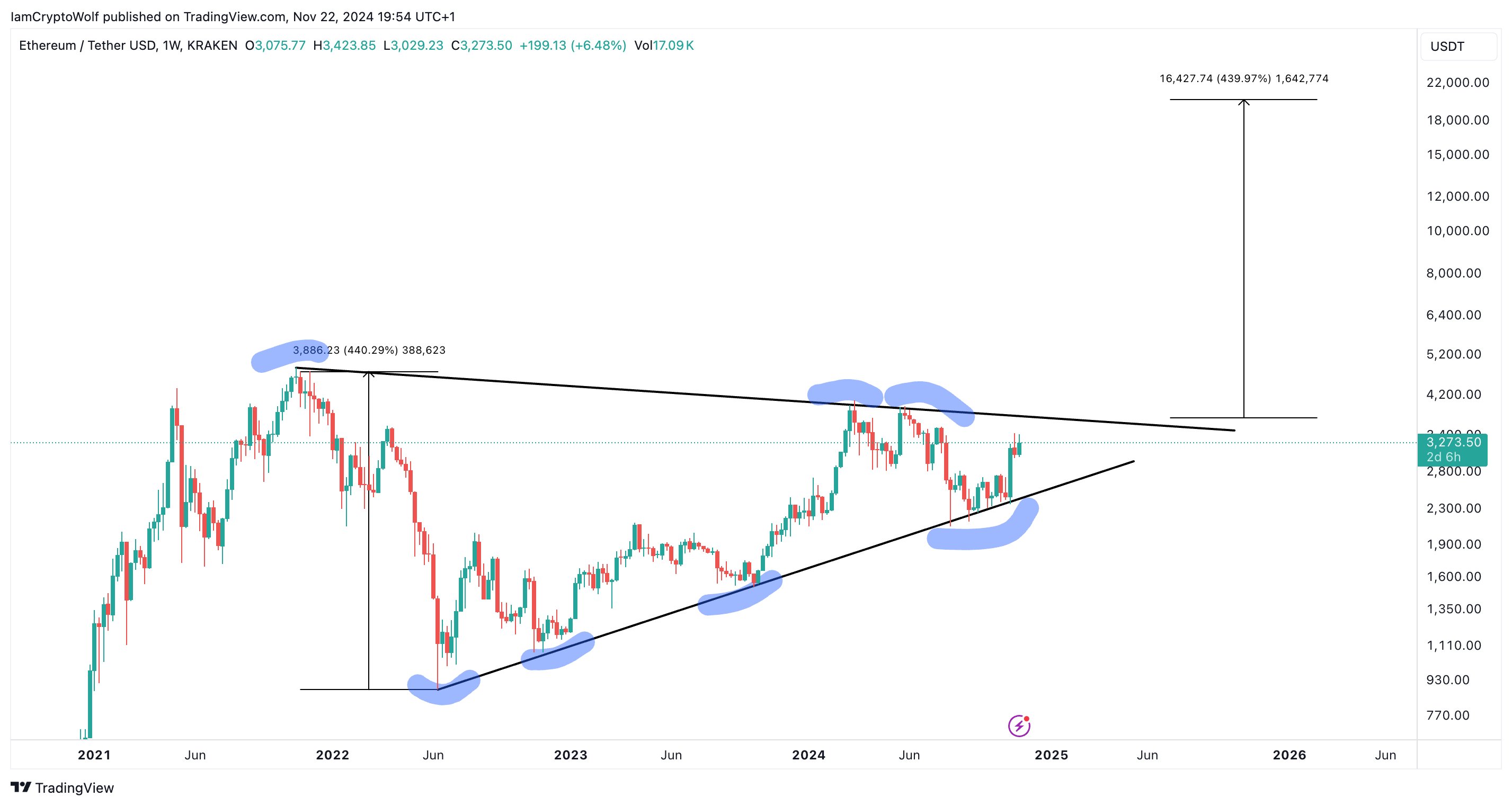 Популярный криптоаналитик Wolf обнаружил на графике Ethereum формирование масштабного треугольника, консолидация в котором длится уже три года — с ноября 2021 года. При пробое этой фигуры цена устремится к отметке $20 000, считает эксперт.