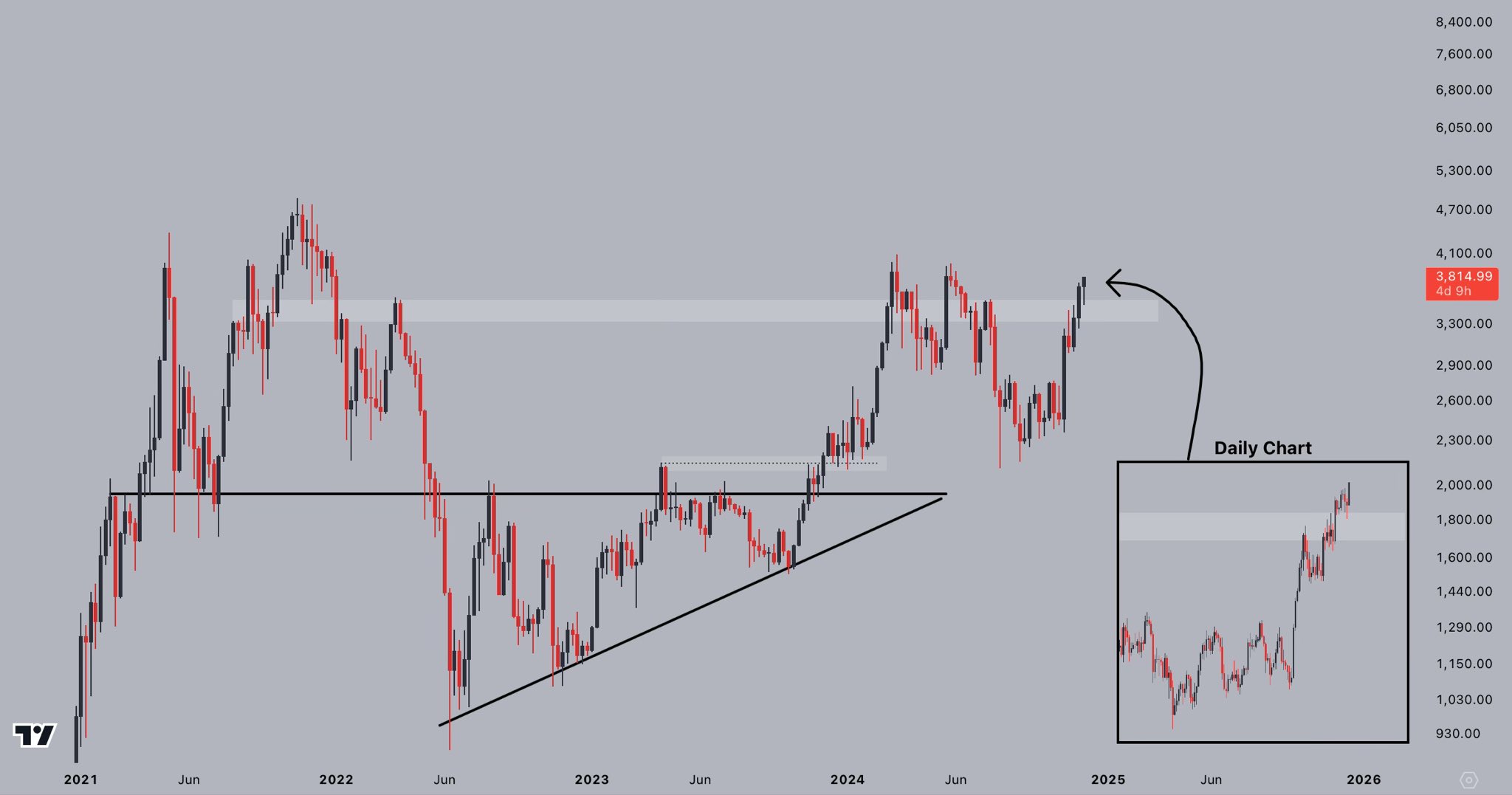 Трейдер Jelle отметил успешное преодоление ключевого уровня сопротивления, который теперь может стать поддержкой на пути к психологически важной отметке в $5 000. Анализ графиков на различных временных интервалах подтверждает формирование благоприятной технической картины.