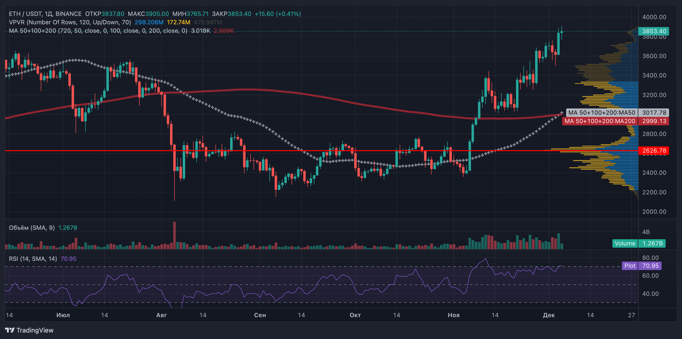 Стоимость Ethereum превысила $3 800 на фоне активизации альткоинов на криптовалютном рынке незадолго до ралли биткоина, который сегодня впервые в истории преодолел отметку в $100 000.