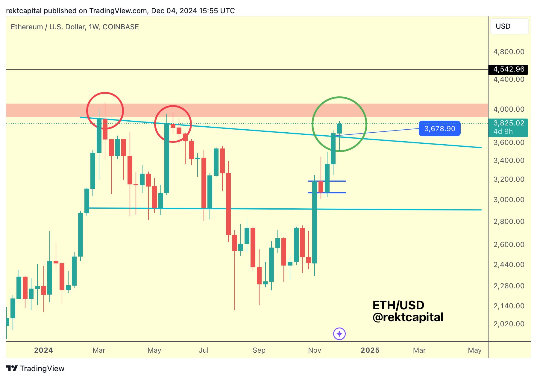 Аналитик Rekt Capital подтвердил успешное тестирование активом трендовой линии в качестве нового уровня поддержки. По его оценкам, стабильность в районе $3 650 должно способствовать движению к отметке $4 000.