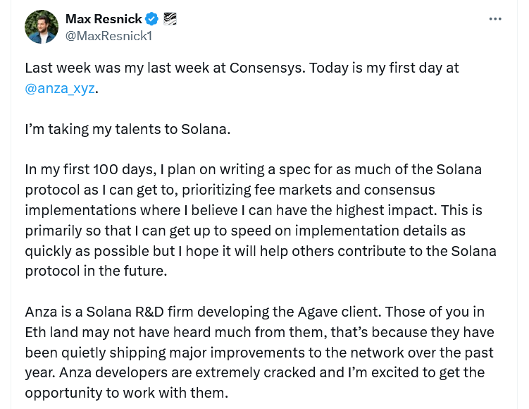 «Я передаю свои таланты Solana», — сказал Резник в сообщении на X от 9 декабря после того, как сообщил, что начал работать в Anza в тот же день.