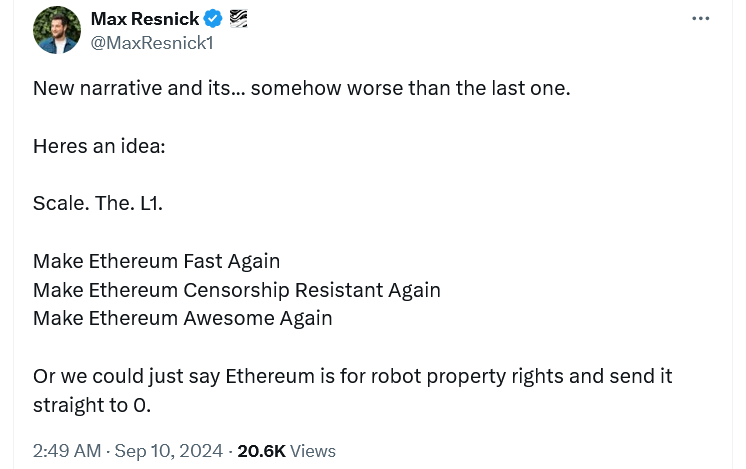 Член сообщества Ethereum Райан Беркманс был рад видеть, как Резник уходит в Solana после того, как он раскритиковал подход Ethereum к масштабированию на Layer 2, утверждая, что он должен сосредоточить свои усилия по масштабированию на базовом уровне, как у Solana.
