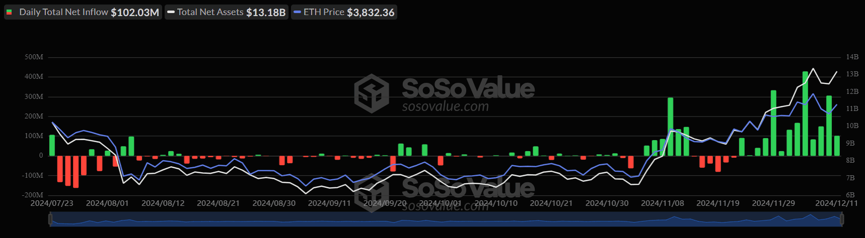 Спотовые Ethereum-ETF ETHA и FETH купили Ethereum на сумму около $500 млн за два дня, согласно данным платформы Arkham Intelligence. Чистый суточный приток капитала в этом секторе 11 декабря 2024 года составил $102,03 млн.