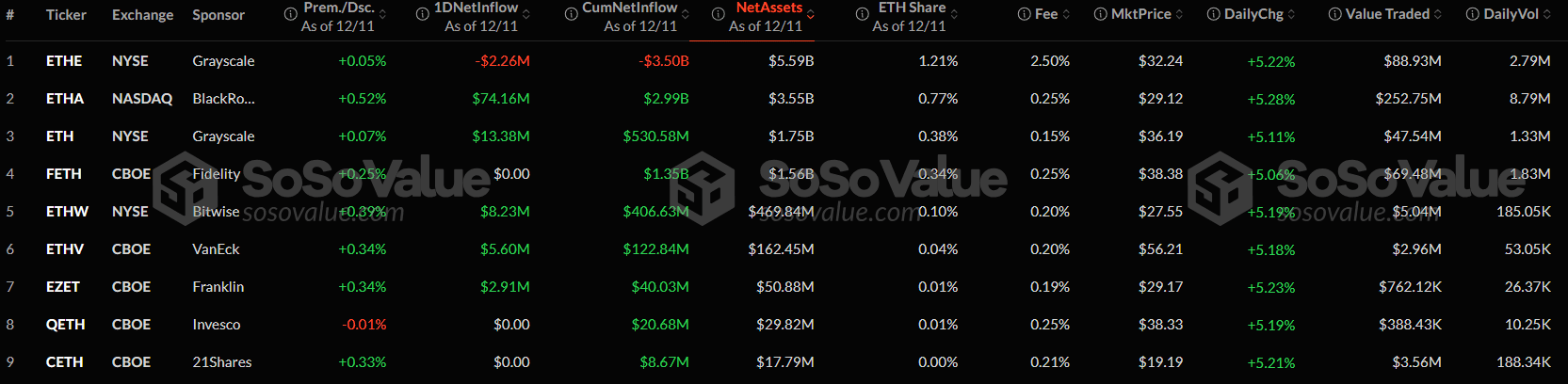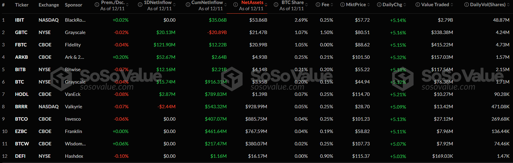 Объем активов под управлением этих ETF составляет $3,55 млрд и $1,56 млрд соответственно. Также они оба отметились положительной динамикой 11 декабря 2024 года. В этот день только один продукт получил отток капитала, от Grayscale Investments.