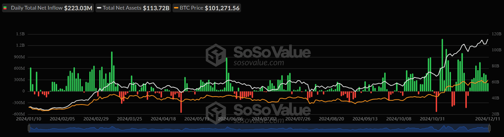 Спотовые биткоин-ETF, в свою очередь, также отметились положительной динамикой. Тут чистый суточный приток капитала 11 декабря составил $223,03 млн.