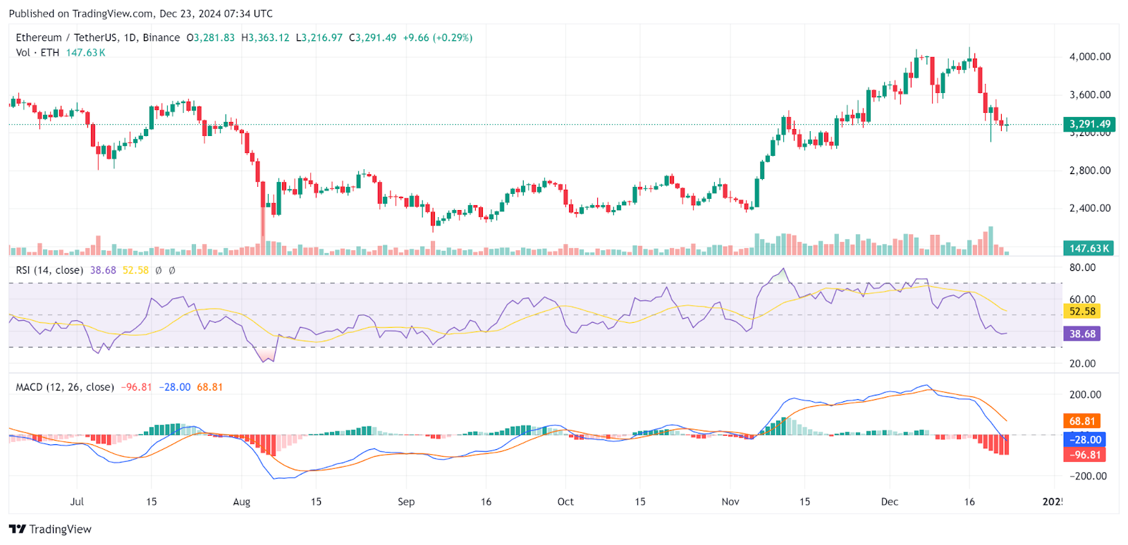 Согласно данным CoinMarketCap, Ethereum упал ниже ценового уровня в 3300 долларов, упав на 1,61% за последние 24 часа и на 17,28% за последние 30 дней. Цифровой актив упал на 32,77% по сравнению с историческим максимумом в $4891,70, достигнутым в ноябре 2021 года, и имеет рыночную капитализацию в $396,21 млрд.