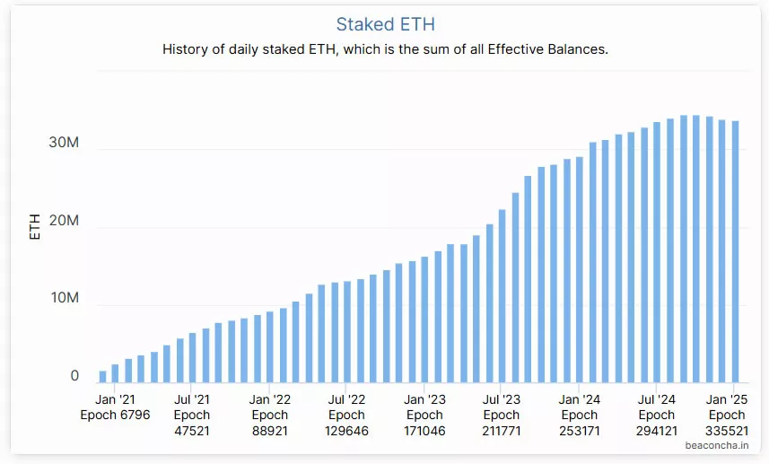 По данным эксплорера Beaconchain, суммарные депозиты Ethereum-валидаторов составляют ~33,7 млн ETH или около 28% рыночного предложения криптовалюты. Торгуемые в США биржевые фонды накопили чуть более 3% от капитализации актива, согласно SoSoValue.