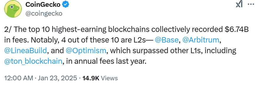 В отчете CoinGecko рассматриваются комиссии за газ, полученные блокчейнами с 1 января 2023 года по 31 декабря 2024 года.